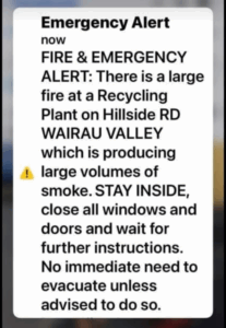 Last Thursday (24th April) the mobile phones of thousands of Aucklanders simultaneously throbbed and wailed as a civil defence emergency announcement was broadcast across the city. A huge and devastating fire had broken out at a recycling centre on the North Shore sending huge clouds of thick black smoke into the air. The emergency announcement directed residents to “stay indoors and shut doors and windows”. My wondering for today is how many actually did?